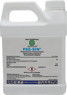INFORMACIÓN GENERAL: PAE-SIN® es un bioinsecticida formulado con conidios de la cepa ABNPf 303 del hongo entomopatógeno Paecilomyces fumosoroseus (Isaria fumosorosea), diseñado biotecnológicamente para controlar mosquita blanca (Bemisia spp.), infectando sus huevecillos, ninfas y adultos hasta causarles la muerte. PAE-SIN® contrala la mosquita blanca en cultivos de berenjena, chile, jitomate, papa y tomate de cáscara.