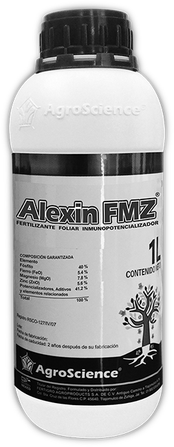 ALEXIN FMZ® es un compuesto molecularmente estructurado con gran concentración en fos?to de fierro, magnesio y zinc altamente asimilables, que en los cultivos favorece la sanidad de la planta, la molécula de ALEXIN FMZ® activa los mecanismos de defensa, que le dan mayor resistencia a las plantas, sin la necesidad de la presencia del patógeno, promoviendo el engrosamiento de las paredes celulares, la producción de compuestos antimicrobiales, principalmente estructuras fenólicas (phitoalexinas) promoviendo las capacidades de la planta para enfrentar mejor los procesos de estrés ya sean de tipo biótico o abiótico, promueve la producción de lignina e hidroxiprolina.