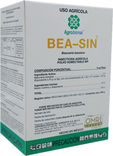INFORMACIÓN GENERAL: BEA-SIN® WP es un bioinsecticida formulado con conidios de la cepa ABNBb 101 del hongo entomopatógeno Beauveria bassiana, diseñado biotecnológicamente, para infectar los huevecillos, ninfas y adultos de mosquita blanca (Bemisia spp.) hasta causarles la muerte. BEA-SIN® WP controla la mosquita blanca en cultivos de berenjena, chile, chile bell, jitomate, papa y tomate de cáscara. BEA-SIN® WP está creado para que los conidios de Beauveria bassiana se adhieran al insecto, germinen y le penetren la cutícula, hasta llegar al hemocele, diseminándose por todo el interior del insecto, causándole la muerte. Los síntomas producidos por BEA-SIN® WP en el insecto son: en huevecillos y ninfas, es el cambio de color y desecación, y en el adulto se observa como si se hubiera impactado en el follaje.