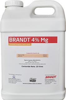 DESCRIPCIÓN: BRANDT 4% Mg es un fertilizante en presentación líquida que contiene en su formulación, magnesio y azufre. BRANDT 4% Mg ayuda a prevenir y corregir deficiencias de dichos elementos. Se sugiere hacer aplicaciones de BRANDT 4% Mg temprano en la mañana o por las tardes para evitar altas temperaturas mayores a los 35 grados Celsius.