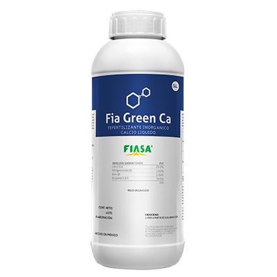 DESCRIPCIÓN: Fia Green Ca es un fertilizante líquido de calcio, formulado con tecnología QLT SYSTEM, de muy alta solubilidad y concentración. Fia Green Ca favorece el fortalecimiento de la pared celular previniendo problemas como el cracking en frutos. Está formulado con base a un complejo de varios agentes quelatantes o secuestrantes de calcio. La aplicación a plantas de Fia Green Ca permite prevenir las deficiencias nutricionales de los elementos menores que contiene y balancear la nutrición general de las plantas, para obtener mejores rendimientos y calidad de cosecha.