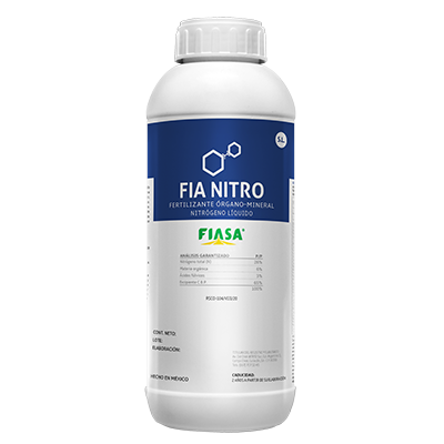 FIA NITRO es un fertilizante, nitrógeno líquido al 32%, formulado con tecnología QLT SYSTEM de alta asimilación, con varias fuentes orgánicas e inorgánicas disponibles. Su formulación incluye adyuvantes que le confieren movimiento lateral en el suelo, lo cual hace que aumente su capacidad de retención, con tecnología que retiene la pérdida de nitrógeno al inhibir la ureasa y retener la nitrificación del mismo, por los procesos del suelo y las bacterias. Contiene aminoácidos, proteínas, una carga biológica rica en promotores de raíces y carbonos provenientes de algas de varios grupos. Todos los microelementos están presentes en su elaboración, grupos promotores de crecimiento que le dan una característica especial y una respuesta rápida con dosis bajas.