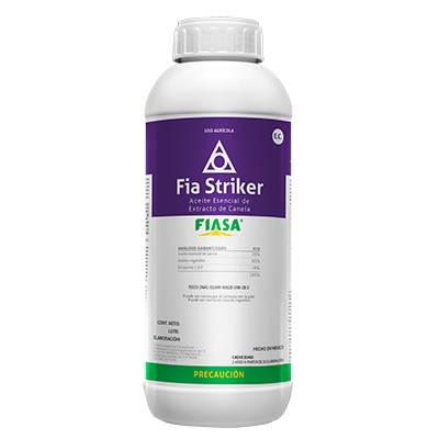 DESCRIPCIÓN: FIA STRIKER es un producto de origen natural elaborado a base de aceite esencial de extracto de canela con acción de contacto. Es fuertemente irritante contra ácaros e insectos de cuerpo blando. No requiere equipo de protección especial durante las maniobras de transporte.