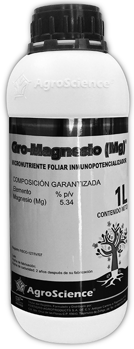 IONGRO-MAGNESIO (Mg) es un fertilizante líquido soluble de alta concentración, ideal para prevenir y corregir deficiencias de magnesio en los cultivos. Las manifestaciones de deficiencias de magnesio son las siguientes: moteado amarillo entre las nervaduras, que comienza de las hojas viejas a las jóvenes; ocasionalmente las hojas se enrollan del envés hacia el haz. La carencia del magnesio conduce a la carencia de clorofila y, por ende, por falta de metabolitos no existe una correcta maduración o término de frutos y granos.