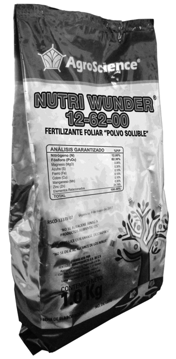 INFORMACIÓN GENERAL: NUTRI WUNDER® 12-62-00 es un fertilizante foliar en polvo cuya fórmula completa asegura un óptimo aprovechamiento de nutrientes, contiene los elementos mayores nitrógeno y fósforo, así como elementos secundarios magnesio, azufre y microelementos, en las proporciones que ayudan a corregir deficiencias nutricionales y que contribuyen a un mejor crecimiento y desarrollo de los cultivos.