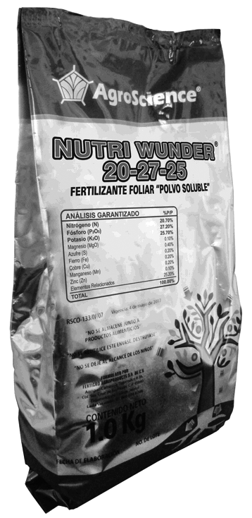 INFORMACIÓN GENERAL: NUTRI WUNDER® 20-27-25 es un fertilizante foliar en polvo cuya fórmula completa asegura un óptimo aprovechamiento de nutrientes, contiene los elementos mayores nitrógeno, fósforo y potasio, así como elementos secundarios magnesio, azufre y microelementos en las proporciones que ayudan a corregir deficiencias nutricionales y que contribuyen a un mejor crecimiento y desarrollo de los cultivos. Es un fertilizante ideal para usarse en cualquier etapa del ciclo vegetativo de las plantas.