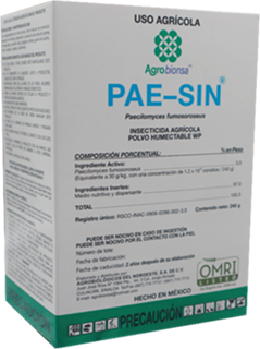 PAE-SIN® WP es un bioinsecticida formulado con conidios de la cepa ABNPf 303 del hongo entomopatógeno Paecilomyces fumosoroseus (Isaria fumosorosea), diseñado biotecnológicamente para controlar mosquita blanca (Bemisia spp.), infectando sus huevecillos, ninfas y adultos hasta causarles la muerte.