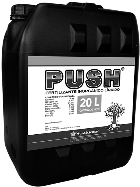 PUSH® es un fertilizante con un pH casi neutro, su fórmula balanceada mejora las condiciones del suelo, así como incrementa el desarrollo de la microflora bacteriana. Se puede aplicar al suelo y vía foliar.