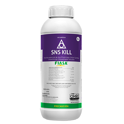 DESCRIPCIÓN: SNS KILL es un repelente que ayuda a regular y controlar las plagas agrícolas a base principalmente de ajo, piretrinas, chile y canela. Al estar en contacto con el insecto, penetra y afecta al sistema nervioso. Con insectos que únicamente tiene un ligero contacto, los ahuyenta, controlando así la población de las plagas.