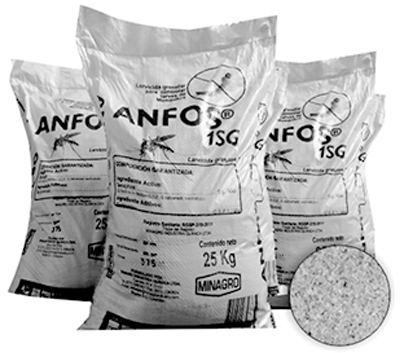 DESCRIPCIÓN: ANFOS 1SG es un larvicida granulado listo para usar, indicado para el control de larvas de zancudos, mosquitos y jejenes, transmisores de enfermedades de importancia en la salud pública como: dengue, zika, chikungunya y ?ebre amarilla. Actúa por ingestión y contacto, temefos inhibe la síntesis de acetilcolinesterasa en la sinapsis neuronal causando disrupción de los impulsos nerviosos y ?nalmente la muerte de larvas, en sus criaderos naturales (aguas estancadas e incluso en aguas de consumo humano), evitándose la emergencia de adultos.