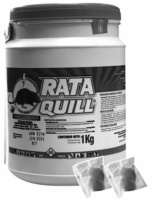 DESCRIPCIÓN: RATAQUILL CEBO EN PASTA es un raticida anticoagulante oleoso de segunda generación, su ingestión causa hemorragias en los roedores plaga y ?nalmente su muerte en 3 a 7 días. Es efectivo especialmente para: Rata de techo (Rattus rattus); Rata algodonera (Sigmodon hispidus); Rata de alcantarilla (Rattus no vergicus); Rata cañera (Zygodontomys spp); Ratón común (Mus musculus); Rata o ratón del arroz (Oryzomys spp).