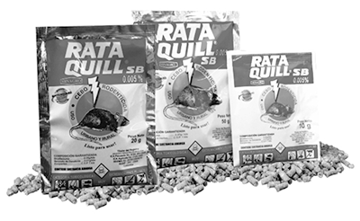 DESCRIPCIÓN: RATAQUILL SB es un raticida anticoagulante de segunda generación, su ingestión causa hemorragias en los roedores plaga y ?nalmente su muerte en 3 a 7 días. Es efectivo especialmente para: Rata de techo (Rattus rattus). Rata de alcantarilla (Rattus novergicus). Ratón común (Mus musculus).